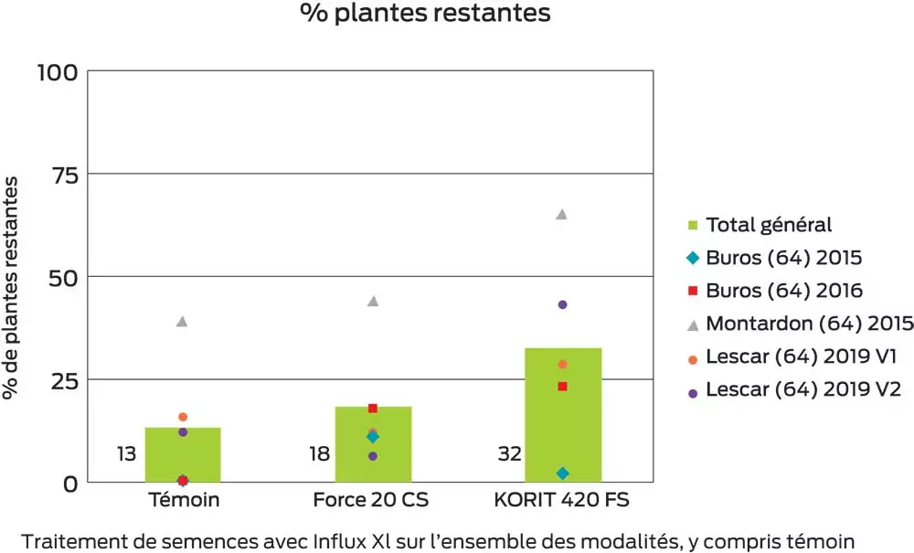 Les solutions disponibles pour protéger les semis contre les dégâts d’oiseaux continuent de se raréfier : la substance active thirame n’a pas été réinscrite au niveau européen. Les produits à base de thirame, partiellement disponibles pour les semis 2019, seront désormais interdits pour les semis 2020. La substance active zirame demeure autorisée au niveau européen jusqu’au 30 avril 2020 (sauf en cas de prolongation ou de nouvelle approbation). Le traitement de semences Korit 420FS (à base de zirame) est autorisé en France et donc encore disponible pour les prochains semis (aucune date de retrait n’est connue à ce jour). Cependant, cette spécialité commerciale présente la mention de danger H330 (accompagnée de H373, H317, H335 et H401) ce qui contraint son application sur semences ; l’utilisation de ce produit ne peut donc pas être généralisée. L’efficacité de Korit 420FS se situe à un niveau comparable aux produits à base de thirame, c’est-à-dire à un niveau relativement satisfaisant en situation de faible attaque, mais fortement limité dès que la pression de population de corvidés devient significative.