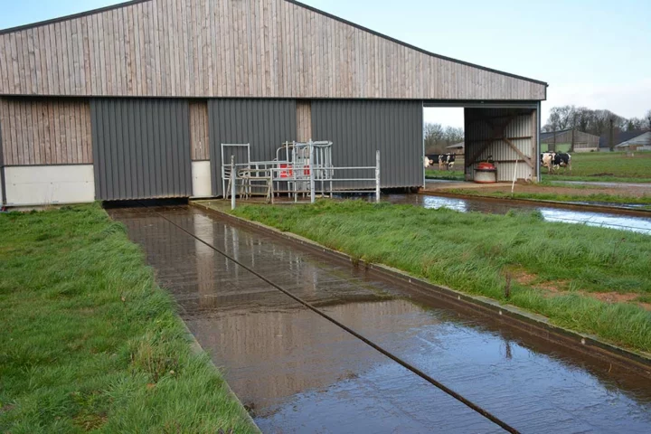 Tous les jours, l’arrière des logettes est raclé et, une fois par semaine, elles sont désinfectées par pulvérisation. Le lisier est transféré avec un racleur à cordes dans une grande fosse à géomembrane.