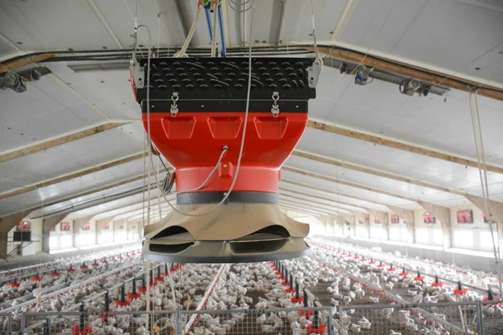 Le chauffage est assuré par un plancher chauffant. Depuis le mois de mai 2019, une pompe à chaleur (Pac) haute température de 15 kW chauffe à 75 °C l’eau qui alimente le plancher. « J’ai installé deux ballons pour stocker l’eau chaude, il y en a un pour le plancher chauffant et l’autre pour l’aérotherme qui est nécessaire à partir de 20 jours d’âge des poulets lorsque la litière isole la dalle béton et qu’il faut être réactif pour gagner quelques degrés. La chaudière gaz vient en complément de la Pac si besoin. » Le plancher chauffant est divisé en 4 zones avec une sonde de température pour chaque zone. Le plancher est à une température de 33 °C au démarrage, puis elle descend progressivement pour arriver à 27 °C à 19 jours d’âge des poulets.