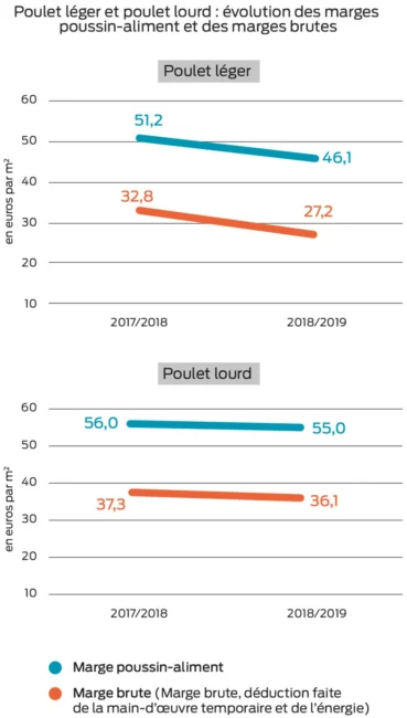 La hausse des dépenses en énergie de 0,7 € par m² s’ajoute à la baisse de la marge poussin-aliment pour aboutir à une diminution de la marge brute de 5,7 € par m² (- 17 %). Ces dépenses supplémentaires en énergie et litière sont nécessaires pour répondre à la demande sociétale en matière de bien-être animal, mais le surcoût n’est pas compensé par les rémunérations.