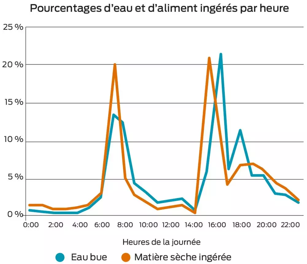La consommation d’eau se fait essentiellement de jour, avec des pics de buvée à la distribution de la ration et en sortie de salle de traite. Or, la chèvre ne fait pas la queue pour boire ! Si elle ne peut pas boire, elle retournera se coucher. On doit donc apporter la disponibilité nécessaire dans les lots. Pour cela, « l’idéal est de mixer les systèmes d’abreuvoir », ajoute Anthony Pouplin, de FranceOvi. Les abreuvoirs à pipette, conçus pour les éleveurs car faciles à nettoyer, ne sont pas « naturels » pour les animaux. Ils mettent plus de temps à boire que dans des niveaux constants.