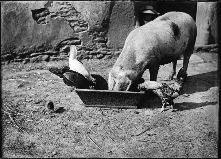 On retrouve en ligne de nombreuses photographies de ces deux frères dont des scènes de la vie rurale bretonne, émouvants témoins du début du siècle dernier arrivés jusqu’à nous. « Gardien de vache » montre un petit garçon tenant l’animal à cornes avec une corde. En tapant « Animaux dans une cour de ferme », plusieurs photos de qualité apparaissent montrant des cochons. Comme le rappelle l’élément de contextualisation : « L’essor de la production porcine commence au milieu du XIXe siècle en Bretagne. Il est lié au développement de la culture de la pomme de terre. Ce tubercule a révolutionné l’élevage du porc, spécialement dans les régions à sols acides et donc à faible rendement céréalier comme la Bretagne. Les familles qui n’en élevaient qu’un peuvent désormais en nourrir plusieurs et préparer la soupe du cochon. »