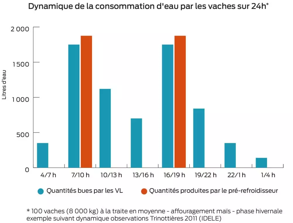 Le réchauffement de l’eau par pré-refroidisseur couvre seulement « 40 % de la buvée journalière, seulement un tiers en été », quantifie Mickael L’Eleouet. Sur un troupeau de 70 vaches laitières produisant chacune 25 kg de lait par jour, « la production d’eau tiède sera de 2 600 L, soit 37 L d’eau par vache et par jour. Le pré-refroidisseur n’alimente donc en aucun cas les abreuvoirs pour la totalité de la journée », ce qui est un point fort : « plus la température de l’eau monte, plus les bactéries se développent rapidement », conclut-il.