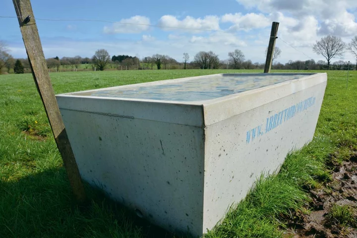 Ces imposants bacs à eau ont été achetés en Irlande à la suite d’une commande groupée de la Cuma du Minez, par camions complets. Différentes tailles sont disponibles, de 2 200 L à 350 L, avec des formes rondes ou rectangulaires, adaptées aux champs comme aux bâtiments. Les modèles d’une capacité de 1 250 L pèsent 1,2 t ; une masse imposante qu’il faut amener au paddock, mais destinée à y rester pendant plusieurs années. Pour la manutention, des filetages en inox sont intégrés au béton afin de recevoir des crochets de levage. « Les bacs de 150 gallons (environ 570 L) sont plus adaptés à des animaux de petit gabarit », conseille John Foale.