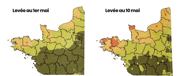 « La Bretagne est en limite de la zone de production, la culture nécessitant 1 400 °C en somme des températures (base 6) depuis la levée pour atteindre une maturité physiologique du soja, stade précédant d’une semaine environ la récolte », rappelle Charlotte Carn, d’Eureden. Avec son équipe, elle a suivi des essais sur quatre années. Avec les variétés 000 disponibles sur notre secteur, la date de récolte peut être atteinte tous les ans en zone verte, 5 à 9 années sur 10 pour les zones jaunes et moins de 4 années sur 10 en zone orange (voir carte). « Plus on sème tard, plus les risques à la récolte augmentent – ou les coûts de séchage seront à prévoir – et la zone des possibilités s’éloigne vers l’est de la région, sauf pour le Sud-Ille-et-Vilaine », précise Nina Rabourdin, de Terres Inovia.