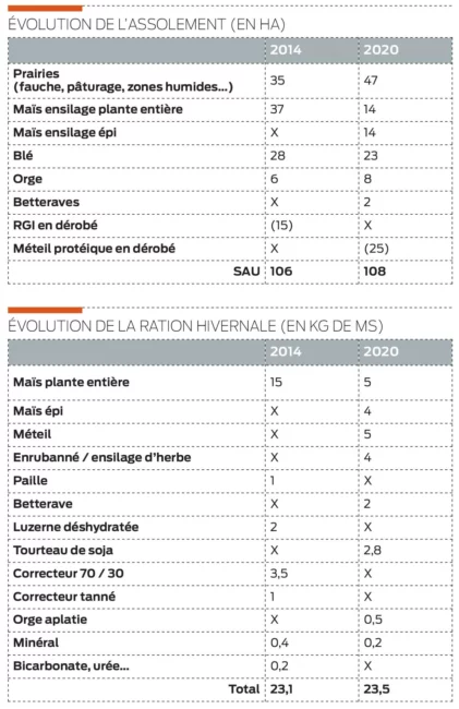 « Aujourd’hui, les animaux ruminent bien. Depuis que le maïs ensilage a diminué, je ne fais plus de cures d’hépato-protecteurs et je n’utilise du bicarbonate que pour les transitions alimentaires. Les problèmes métaboliques sont plus rares et les frais vétérinaires ont baissé », rapporte Maxime. Il livre en moyenne 31,6 L de lait par vache et par jour, à 34,6 de TP et 43,1 de TB (contre 32 et 39 auparavant). « Par rapport à l’ancienne conduite basée sur le maïs ensilage, le niveau d’étable est resté relativement stable. Mais les taux ont grimpé. »