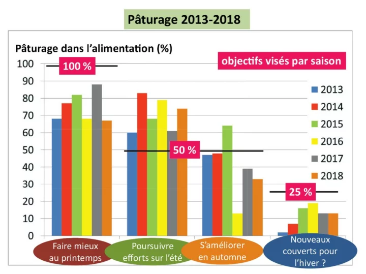 « En année sèche, elles peuvent être consommées dès la fin août, jusqu’au retour des pluies. Les vaches repassent alors sur les prairies et retournent plus tard sur les betteraves. Si une partie est consommée précocement, nous y semons un méteil début octobre avec une dominante avoine pour un pâturage en janvier (2 tonnes de MS/ha environ) ». En 7e année de rotation, un sorgho fourrager multi-coupes est implanté pour un pâturage d’été. Il est associé à du millet et à des trèfles vésiculé et d’Alexandrie. « Nous allons, dès 2020, inclure des navets dans le mélange car ils résistent bien à la sécheresse et ont une bonne valeur alimentaire. En association, ils sont mieux protégés des attaques d’insectes ». Cette culture produit jusqu’à 4 à 5 tonnes de MS, consommées en période estivale quand les prairies sont à l’arrêt. Ces cultures ne bénéficient d’aucune fertilisation (seulement les restitutions des années précédentes, au champ).