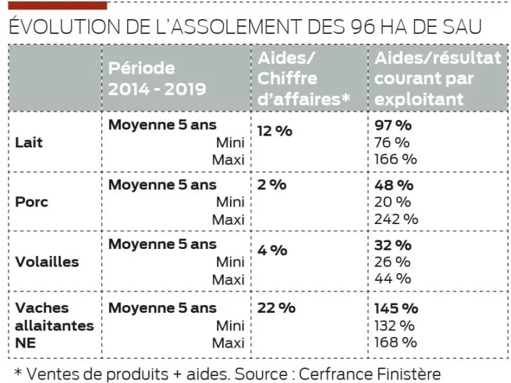 Deux chiffres éclairent la situation en la matière : la part des aides dans le chiffre d’affaires de l’entreprise et dans le revenu des producteurs. Deux productions se situent à l’opposé : le porc et les vaches allaitantes (naisseurs engraisseurs). En moyenne sur les 5 dernières années, les aides et subventions ne représentent que 2 % du chiffre d’affaires de la production porcine contre 29 % pour les vaches allaitantes. Ramené au revenu, on passe de 48 % en porc à 145 % en vaches allaitantes. À chaque fois qu’on passe la barre des 100 %, les aides sont supérieures au revenu. Mais les variations d’une année sur l’autre sont elles aussi instructives : stabilité en vaches allaitantes contre fortes fluctuations en porc, à l’image du revenu. Lors de la bonne conjoncture porc de 2017-2018, les aides n’ont contribué qu’à 20 % du revenu alors qu’elles ont pesé pour 242 % lors de la crise de 2015-2016, constituant alors un véritable filet de sécurité. Pour les producteurs de bovins, il s’agit plutôt d’une rémunération complémentaire permanente. Les exploitations laitières sont dans un schéma intermédiaire, avec des aides pesant pour 12 % du chiffre d’affaires, mais représentant, en moyenne depuis 5 ans, près de 100 % du revenu, avec un minimum de 75 % dans la conjoncture la plus favorable (2014-15) et un maximum de 166 % pour l’année de crise 2016-17.