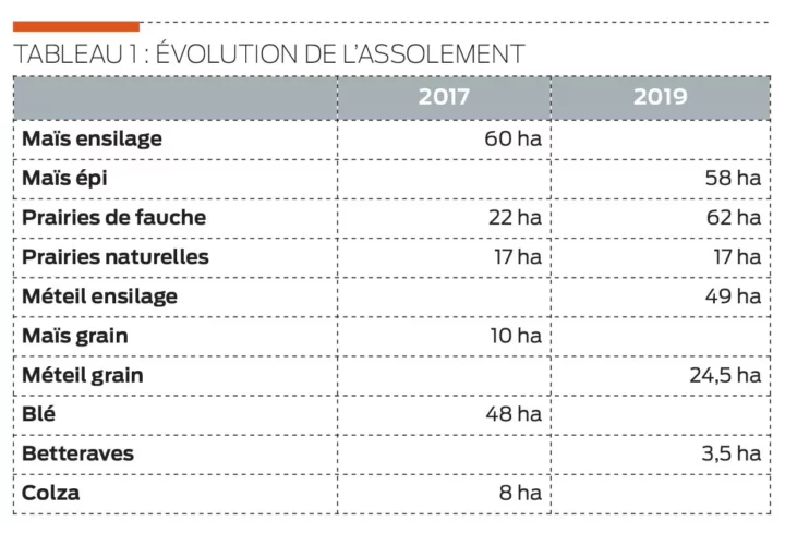 Le blé et le colza ont disparu de l’assolement. « Avant, avec 250 taurillons, nous récoltions 90 ha de maïs ensilage. Le tas faisait 150 m de long. C’était un chantier qui marchait, mais c’était avant », se rappelle Christian Léon. Après l’arrêt des taurillons, cette surface de maïs s’est réduite à 60 ha. Mais depuis deux saisons, le maïs plante entière n’est plus récolté en ensilage, « sauf 10 ha la première année, pour sécuriser le stock ». La surface équivalente est dorénavant valorisée sous forme de maïs épi. « Cette sole de maïs sera néanmoins réajustée car nous avons trop de stock ». « On a aussi récolté 97 q sec/ha de maïs grain, semé le 29 mai, après le méteil ». Le méteil, qui est apparu dans l’assolement, est semé en novembre et ensilé.