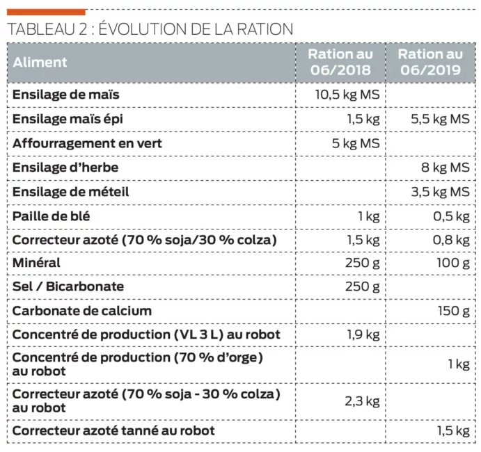 Avec une diminution de 2,4 kg de concentrés par jour en un an, l’arrêt de produits tampon, la ration distribuée en juin, entre 2018 et 2019, a permis un gain de 132 € de concentrés par jour, soit 40 €/1000 L. La production laitière est stable, le TB est passé de 37,5 à 43 g/L, effet de la météo avec de fortes chaleurs. Le taux d’urée dans le lait a diminué de 250 à 210, « preuve de la meilleure efficacité de l’azote ». La marge brute, avec une clôture comptable à fin septembre, est passée de 163 à 213 €/1 000 L, période ne comprenant que 3 mois de distribution de l’ensilage de méteil. Par contre, les éleveurs observent de meilleurs résultats de fertilité. Seuls la paille et le correcteur azoté sont achetés.