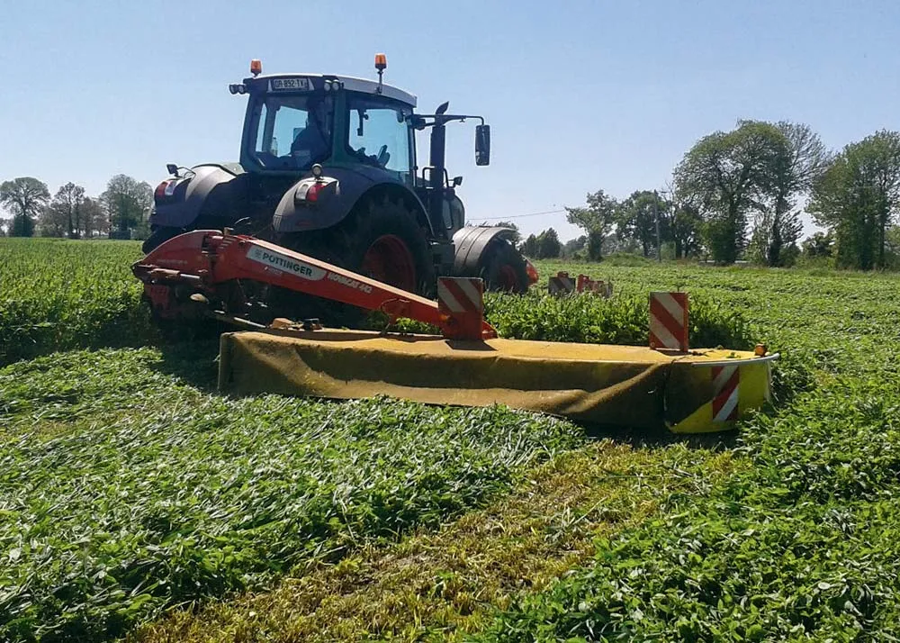 « Sur les parcelles de fauche, on apporte 10 t de fumier par hectare à l’automne. » La récolte est assurée à l’ensileuse. Le résultat n’est pas trop haché car il y a un apport de méteil. Les coupes sont mises bout à bout. « Les produits étant de qualité, la transition se fait dans le silo », précisent les éleveurs. Le RGA est fauché tous les 40 jours, le trèfle violet, tous les 26-28 jours. Le méteil — pois, vesce, triticale, avoine d’hiver — est fauché par le Gaec juste avant la floraison, autour du 10 mai, avec une faucheuse double de 7,5 mètres, puis andainé avec un andaineur déporté double de 8,5 mètres. Le rendement est de 8,5 t MS/ha. À l’avenir, les associés feront appel à une ETA qui possède un andaineur à tapis.