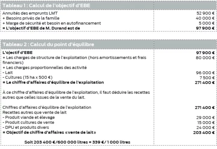 Pour réaliser ce calcul, il faut partir de l’objectif d’EBE auquel on ajoute les charges proportionnelles et de structure (excepté les amortissements et les frais financiers). Autrement dit, il s’agit de la somme à dépenser pour faire fonctionner la totalité de l’exploitation. Afin d’isoler la somme qu’il reste à couvrir par la seule vente de lait, il faut déduire du chiffre d’affaires de l’exploitation les ventes et produits reçus autres que le lait. L’avantage de ce calcul simple est de le comparer au prix de vente prévisionnel afin d’anticiper d’éventuelles difficultés de trésorerie.