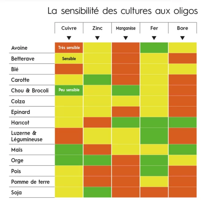 Les oligo-éléments interviennent dans de nombreux phénomènes comme la photosynthèse, la croissance, la fertilité, la synthèse des protéines et des glucides, la fixation de l’azote, la migration des sucres… Il est donc très important de les analyser pour consolider le diagnostic (voir le tableau des sensibilités culturales). Nous sommes en période idéale pour programmer vos analyses de sol pour la saison prochaine, n’hésitez pas à contacter votre technicien Eureden.