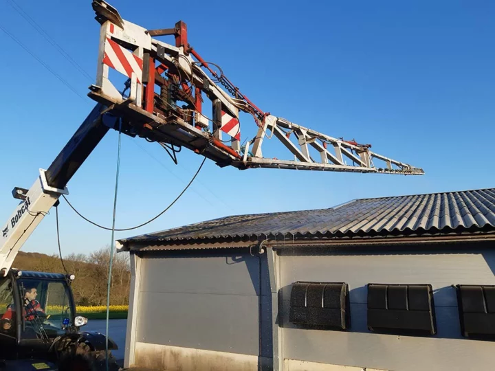 Julien Brignou a adapté une rampe de pulvérisateur de 12 m sur la flèche de son télescopique pour se faciliter le travail et gagner du temps lors de l’application de l’anti-mousse sur les toitures des poulaillers.
