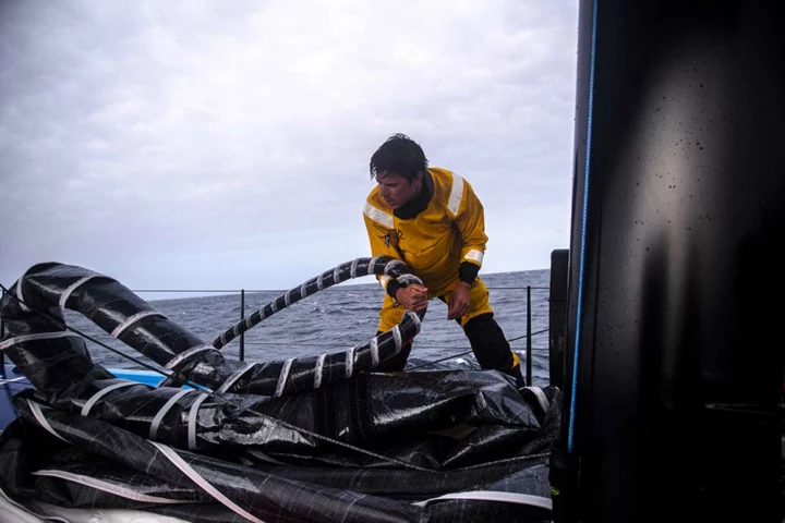 Sur le vaste plancher de la voilerie, plusieurs anciennes voiles du 60 pieds Arkéa-Paprec sont étalées. Craquelé, marbré de plis, délavé par le soleil, le tissu arbore les stigmates d’une vie antérieure placée sous le signe des embruns et des navigations au long cours. Des traces qui sont comme autant d’invitations au voyage et à la rêverie. Trop usées désormais pour servir en compétition, ces voiles du coursier skippé par le navigateur Sébastien Simon vont entamer une deuxième vie. À terre, cette fois.
