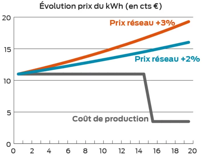 Le graphique ci-dessous est un exemple de comparaison de l’évolution du coût moyen de l’électricité du fournisseur (EDF ou autre) sur les 20 prochaines années (+ 2 % ou + 3 % /an) au coût de l’électricité produite et autoconsommée sur l’exploitation. Ici l’installation photovoltaïque sur toiture a un coût d’électricité autoconsommée estimé à 10,50 cts €/kWh pendant les 15 premières années (annuité de remboursement + coût de maintenance) et ensuite 3,5 cts €/kWh (coût de maintenance seul).
