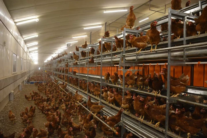 Lors de la mise en place du lot de pondeuses celles-ci sont placées dans la structure. Des grillages bloquent l’accès au-dessous de la volière pendant les 4 à 5 premiers jours. « C’est sous la volière que l’on peut avoir les plus gros soucis de ponte au sol c’est pour cela que l’on bloque l’accès au démarrage et qu’ensuite nous mettons un éclairage assez fort pour qu’il n’y ait pas de zones d’ombre. »