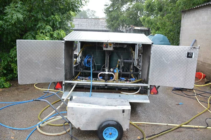 Après le départ des poulettes, le premier chantier est de vider les fientes. Ensuite la société de nettoyage peut intervenir. « On commence par pulvériser un détergent sous forme de mousse pour faciliter le lavage. Il va rester en contact avec la volière pendant 1 heure », décrit Brian Le Ny, salarié de l’entreprise Agri Hygiène. Chaque laveur est équipé d’une pompe haute pression thermique de 38 litres par minute de débit. L’équipe est composée de 2 à 4 laveurs selon les chantiers. « Pour la volière Vencomatic, on commence par dégrossir le dessous des caillebotis puis l’éleveur déplie la structure pour que l’on puisse s’attaquer au dessus des caillebotis. Ensuite, nous démarrons le lavage des chaînes d’alimentation, pipettes, plateaux des côtés et la coque du poulailler. L’éleveur replie la volière pour tout rincer une dernière fois et nous terminons par le sol en envoyant tout vers les évacuations. » Toutes les eaux de lavages sont récupérées et stockées dans des fosses avant d’être épandues sur les terres. La dernière étape est la désinfection en pulvérisation liquide. Puis l’éleveur réalise une désinfection par thermonébulisation 48 heures avant l’arrivée des poussins.