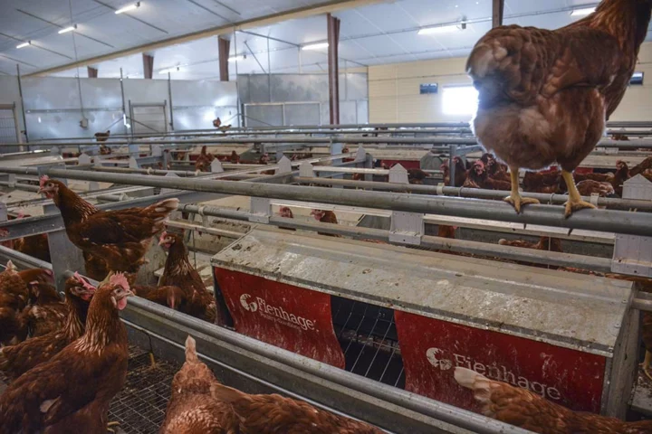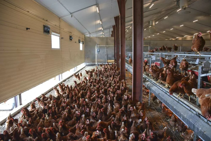 Pauline Cadoret, de la SCEA Bio C’Baud, à Baud (56), a installé 4 rangées de mini-volières dans un ancien poulailler de 40 000 pondeuses cages, elle y élève aujourd’hui 12 000 poules bio qui profitent d’un grand volume baigné de lumière naturelle.