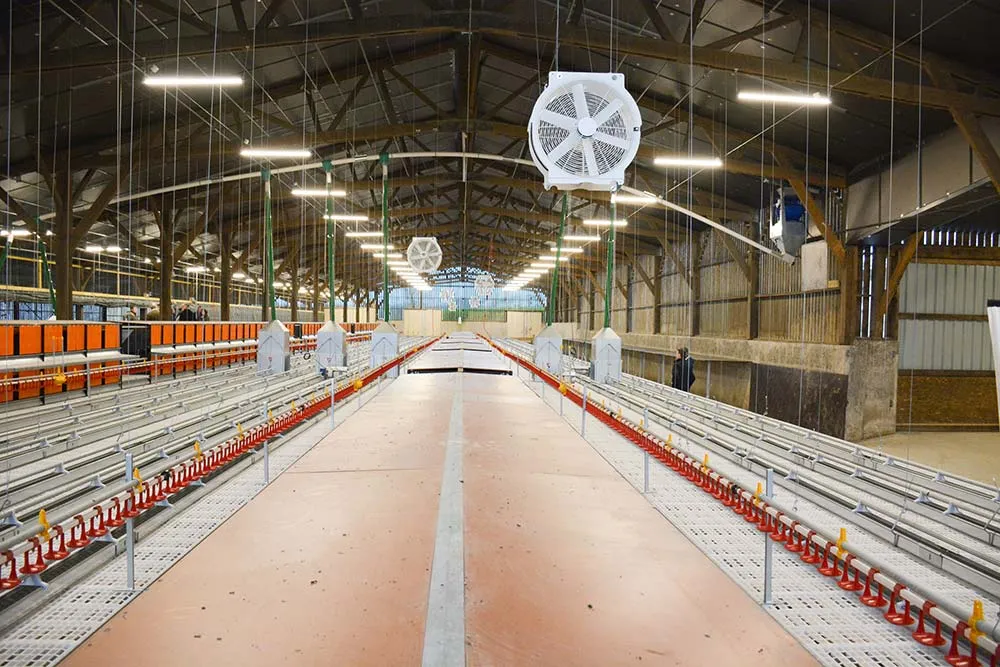 Sébastien Mahé a eu l’idée un peu folle de transformer la stabulation des laitières en bâtiment d’élevage pour pondeuses. « Mon projet sort des standards, le bâtiment est très volumineux. Il fallait trouver comment isoler et quelles étaient les solutions pour le relevage du matériel. L’entreprise de construction Le Couillard et Agromat pour le matériel d’élevage m’ont accompagné dans mon projet. », explique l’éleveur. La dernière traite a eu lieu le 14 septembre 2019 et les travaux pour transformer la stabulation en poulailler se sont achevés le 12 février 2020. Le bloc de traite, les dalles et les murs en béton ont été cassés. Une dalle a été coulée dans l’ancienne aire paillée. La salle de traite est devenue le centre de conditionnement, le stockage des œufs et emballages a pris place dans l’ancienne nurserie, la laiterie est maintenant un sas sanitaire et un bureau. « Nous avons allongé et élargi le bâtiment sur une partie pour créer un jardin d’hiver avec l’accès au parcours d’un côté. Nous avons posé un isolant noir sous toiture qui a pour effet de limiter les reflets dans le bâtiment ce qui calme les poules et limite le phénomène de piquage », décrit Bertrand Bouder, commercial chez