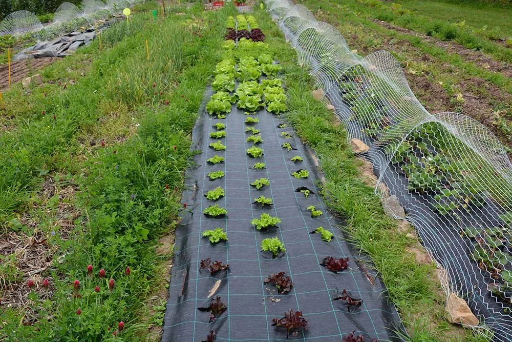 Pour les légumes sous serre et de plein champ, le jeune producteur est parti sur la technique de maraîchage sur sol vivant. Le grand principe est de cultiver le sol avant de cultiver les légumes. « Tout d’abord il faut nourrir le sol en apportant de la matière organique carbonée en mulchage, sous forme fraîche de préférence (déchets verts, foin, fumier…). L’idée est de bouleverser le sol au minimum et donc de ne pas le travailler ou juste l’aérer/décompacter ponctuellement. En redynamisant le sol on s’y retrouve rapidement au niveau de la production. » Florian a mis en place un principe de culture en planches permanentes de 30 m de long sur 75 cm de large. Le but est de toujours cultiver la même planche, avec une rotation réfléchie des cultures. Les mauvaises herbes se développent moins car le sol n’est pas travaillé. Chaque planche est recouverte d’une couche de matière organique pour nourrir le sol, limiter le développement des adventices et garder l’humidité. Pour certains légumes tels que les courgettes ou les salades le maraîcher utilise une toile tissée ou bâche d’occultation le temps de la culture. Cette toile est ensuite déplacée et mise sur une autre bande pour assurer une bonne rotation. « La toile va être réutilisée pendant 10 ans. Je l’ai percée pour une culture spécifique et elle va resservir spécifiquement pour cette culture. » Par exemple, quand toutes les salades seront récoltées, la toile sera enlevée et le maraîcher va ensuite semer directement des radis dans cette planche qui sera totalement propre (sans adventices).