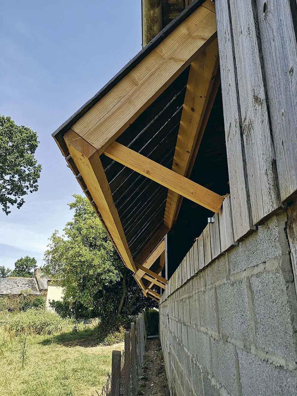 Bricoleurs dans l’âme, ils sont partis sur une suggestion de leur voisin menuisier : l’idée était de découper le claire-voie du pan nord, une travée sur deux, et de réaliser un bardage sur rail, avec des guides et des butées. Simple, économique, pour un montant n’excédant pas 200 € pour la réalisation des deux premiers bardages coulissants, à raison d’une demi-journée de travail à deux personnes, le chantier est lancé en juin dernier. Au-dessus des parpaings (hauteur de 1,20 m), des fenêtres ont été découpées sur des dimensions de 1,60 m sur 3 m de longueur. Un rail de 6 mètres a été installé pour recueillir le nouveau bardage mobile, réalisé avec des planches de 17 cm espacées de 2,5 cm (au lieu de 1,8 cm d’espacement sur le bardage fixe), le tout fixé sur un tasseau. « Nous avons racheté des planches mais nous aurions aussi pu récupérer le bardage existant », précise Jean-François Cainjo. « Il faudra peut-être prévoir un tasseau supplémentaire au milieu du bloc mobile pour rigidifier le tout et assurer sa pérennité, ainsi qu’un guide supplémentaire pour éviter toute prise au vent en position fermée », conseille Philippe Le Mestrallin, conseiller technique spécialisé ambiance bâtiment au GDS Bretagne.