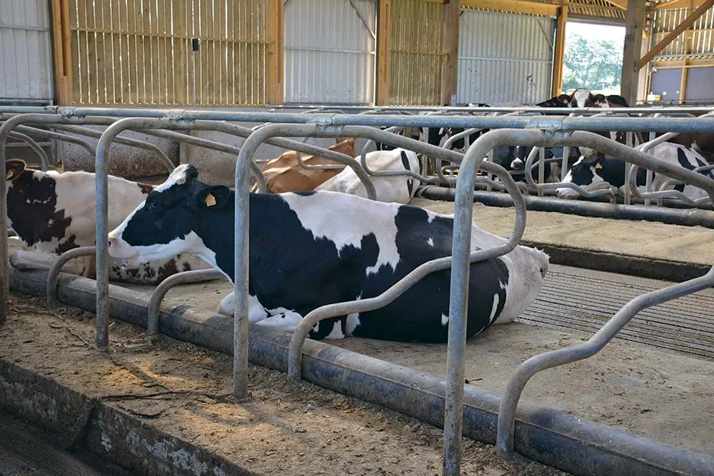 Les 200 logettes sont équipées de matelas avec poches d’eau d’une trentaine de litres, pour un meilleur confort (garantie dix ans). À l’avant, une genouillère (boudin) est également remplie d’eau (sur toute la longueur de l’étable). Les aires d’exercice sont équipées de tapis raclés (dix fois par jour en hiver) pour éviter les glissades. Les jus sont collectés en pignon (2 % de pente) dans une fosse de 400 m3, broyés (pompe hacheuse) et dirigés vers deux fosses existantes. Les passages entre rangées de logettes sont également recouverts de tapis. Les logettes sont nettoyées une fois par jour par passage d’une balayeuse. Derrière les rangs de logettes, une petite pente, sur une vingtaine de centimètres, permet l’écoulement des jus vers la partie raclée pour assurer la propreté des queues des vaches. Aucun produit asséchant n’est utilisé. L’étable compte neuf abreuvoirs gros débit, alimentés par une cuve de 13 000 litres, avec vidange rapide.