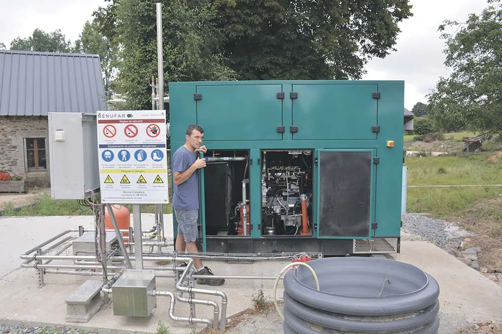 « Nous installons une couverture flottante pneumatique (inspirée de ce qui existe sur les bateaux Zodiac) sur les fosses à lisier. Ici la fosse fait 31,5 m de diamètre, nous l’avons donc équipée avec une couverture de 30 m de diamètre ce qui lui permet de monter et descendre sans s’abîmer selon les quantités de lisier qu’il y a dans la fosse », décrit Rémy Engel, gérant et fondateur de l’entreprise Nénufar. Cette couverture de fosse a la particularité de récupérer le biogaz qui se dégage habituellement dans l’atmosphère pour le valoriser sur l’élevage. « Nous avons débuté en couvrant les fosses des élevages de porc. Le biogaz récupéré est utilisé pour alimenter des chaudières qui servent à chauffer les salles d’élevage. On ne pensait pas que la production de biogaz serait suffisante pour faire tourner un moteur, mais notre expérience en porc nous a prouvé que cela serait envisageable. » La rencontre avec la famille Cadio et leur envie de couvrir leur fosse avec le système Nénufar en valorisant le biogaz par de la petite cogénération a permis de lancer ce nouveau concept. Le choix s’est porté sur un moteur d’une puissance de 36 kW qui correspond bien à un atelier de 150 laitières et qui permet des démarches de raccordement rapides et peu coûteuses avec Enedis.