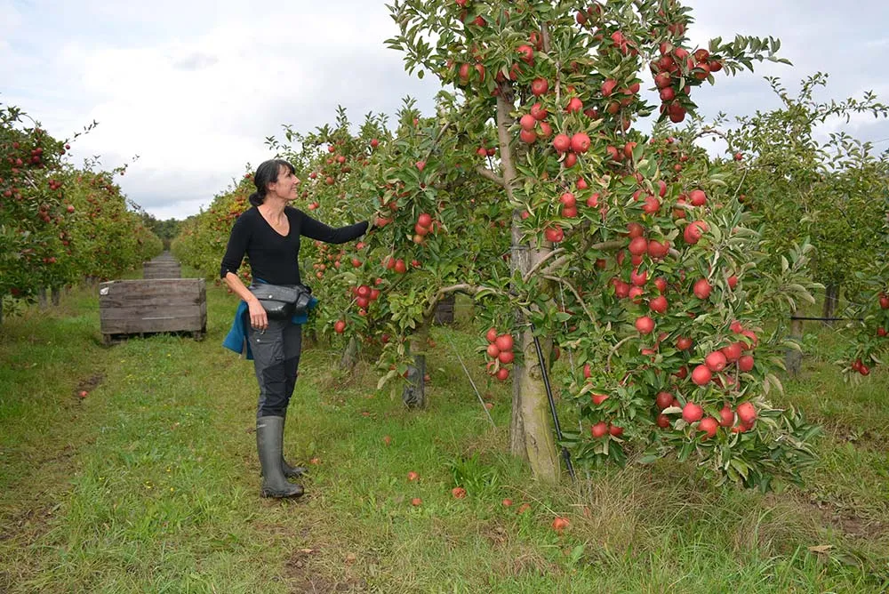 Elle emploie une salariée à temps plein, 6 à 10 saisonniers pour l’éclaircissage et 8 à 10 pour les récoltes qui débutent fin août jusqu’au 20 octobre, puis se terminent avec deux variétés plus tardives. Près de la moitié du verger est en Reinette d’Armorique avec onze autres variétés à côté. « En général, je mets 50 % de Reinette d’Armorique dans mes remorques destinées aux jus de pommes. Cette variété convient bien… » Elle est moins productive que d’autres, mais offre une bonne conservation.