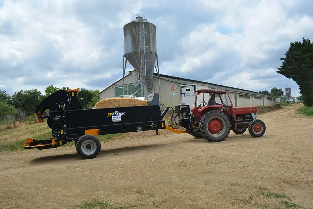 Jérémy Pivron est éleveur de poulets de Loué sur la commune de Soulitré (72) possède 3 poulaillers label de 400 m2. Dès son installation l’éleveur a fait le choix de mécaniser le paillage. « Jusqu’à cette année j’utilisais une dérouleuse-pailleuse portée ce qui nécessitait l’utilisation du tracteur de 100 chevaux qui est celui qui possède aussi le chargeur. Ce tracteur sans cabine est le seul à pouvoir rentrer dans les poulaillers », décrit l’aviculteur. Le paillage de chaque poulailler avant l’arrivée des poussins nécessite 8 big de paille broyée. À chaque botte, le matériel de paillage devait être dételé pour pouvoir charger une nouvelle. Entre 35 et 84 jours d’élevage Jérémy Pivron fait un repaillage une à deux fois par semaine dans chaque poulailler avec un round par bâtiment et par passage.