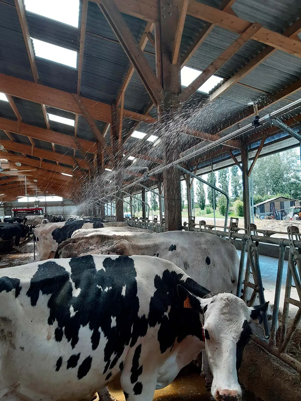 En 2020, la circulation des vaches est restée habituelle lors des fortes chaleurs. « Elles apprécient le douchage, viennent manger quand il se déclenche. Nous sommes restés à une distribution de ration quotidienne et n’avons pas eu plus de mammites qu’à l’ordinaire (nous en avons peu). Avec l’eau qui arrive au-dessus des cornadis, le fourrage reste appétent », constatent les éleveurs.