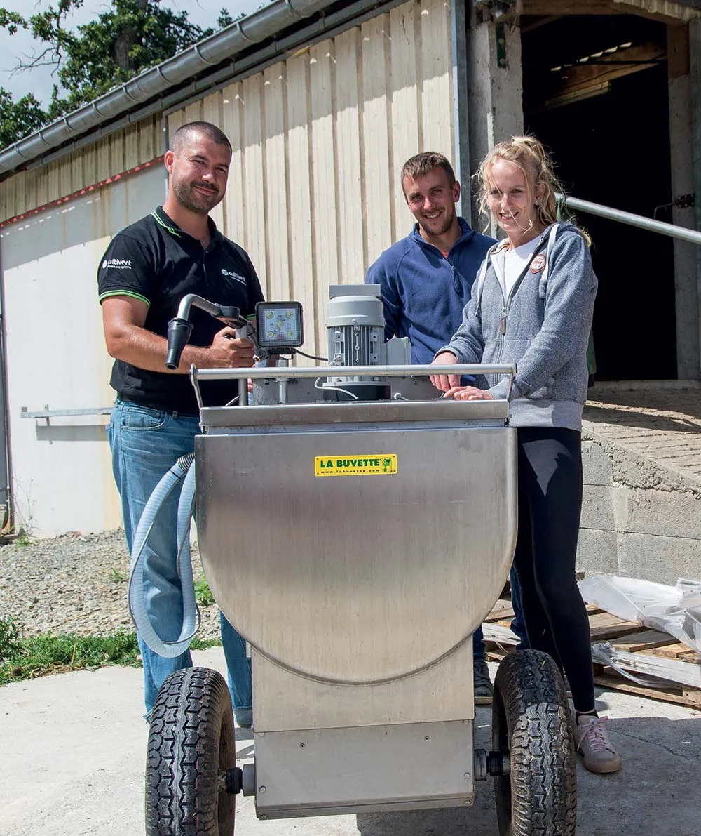 L’appareil dispose également d’une fonction bain-marie grâce à sa paroi double cloison. Coraline Louvet verse dans un premier temps l’eau à 50 °C puis la poudre de lait. Le mélange est alors mixé dans la cuve et prêt à être distribué entre 42 et 45 °C. « La température peut être ajustée au degré près et l’appareil dispose également d’une fonction antigel qui peut être très utile en hiver : une buvée distribuée à la bonne température limite les troubles digestifs et favorise une bonne ingestion et par conséquent la bonne croissance du veau », complète le technicien.