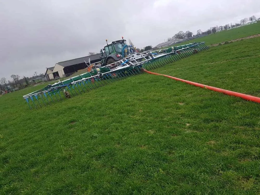 L’entreprise réalise de l’épandage sans tonne depuis environ 10 ans avec une rampe pendillard de 12 mètres. La nouveauté 2021, pour l’atelier lisier est l’acquisition d’un 2e épandeur sans tonne avec une rampe Bomech à patins de 18 m de largeur permettant de déposer le lisier en sillon au pied de la plante, sans éclaboussure, ni souillure des végétaux. « Sur les prairies, les vaches peuvent arriver plus tôt… Les émissions d’azote et les odeurs sont réduites avec ce système qui peut par ailleurs aller plus près des habitations », expliquent des salariés de l’ETA.