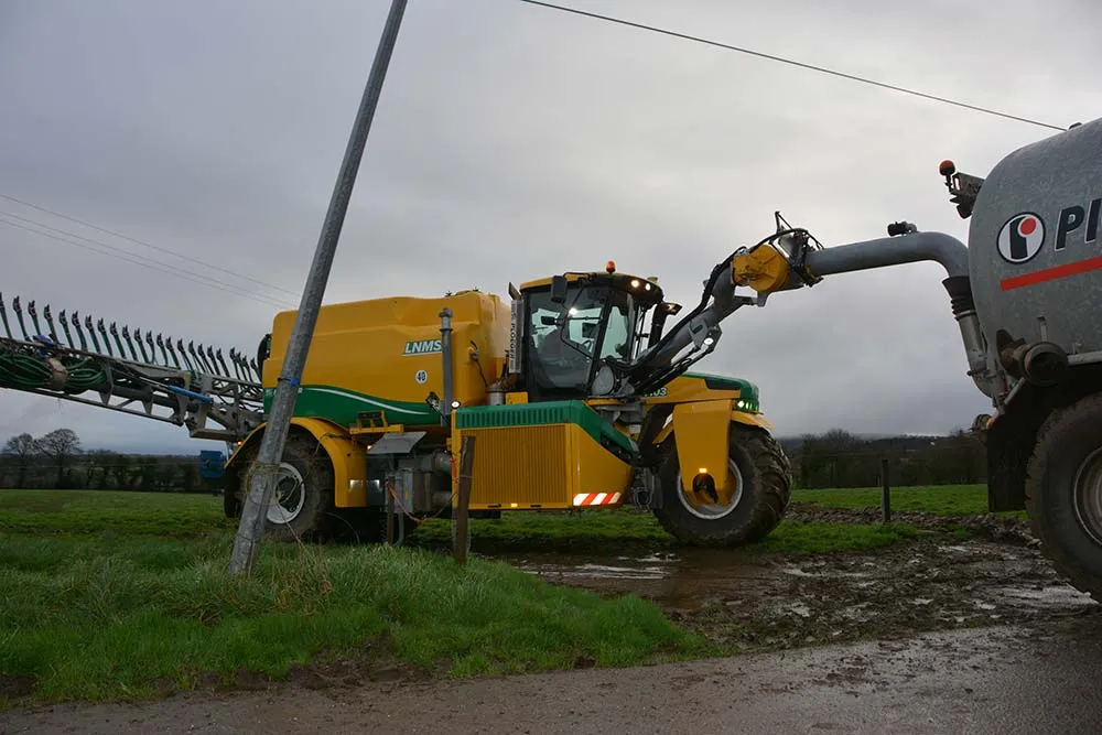 Les tonnes à lisier de l’ETA serviront désormais uniquement au ravitaillement de l’automoteur. « Je préfère cette solution à des cuves tampons posées dans les champs : les manœuvres sont nombreuses à l’endroit où la cuve est déposée, il y a de fortes zones de compaction. Grâce aux citernes de ravitaillement, la tonne peut emprunter les traces du pulvérisateur pour rejoindre l’automoteur ». Pour un chantier au parcellaire adapté, Patrice Emery espère pouvoir épandre 1 000 m3 par jour, les 400 cv du moteur Scania permettent d’atteindre une vitesse d’application entre 8 et 10 km/h. Pour pouvoir obtenir ce débit, le facteur limitant sera l’approvisionnement en lisier : 2 tonnes de ravitaillement au minimum sont nécessaires pour ne pas faire attendre le chauffeur de l’automoteur. Grâce à son bras de pompage avec un angle de d’évolution de 360 °, le pompage peut s’effectuer facilement jusqu’à une distance de 2,75 m et une hauteur de 4,5 m.