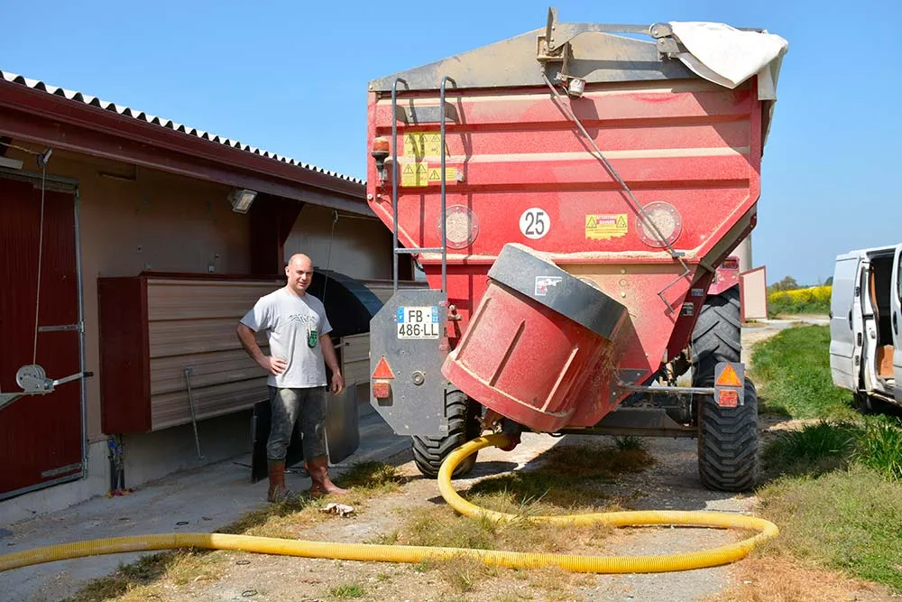 Un tuyau allant à l’intérieur du bâtiment est branché sur la remorque.