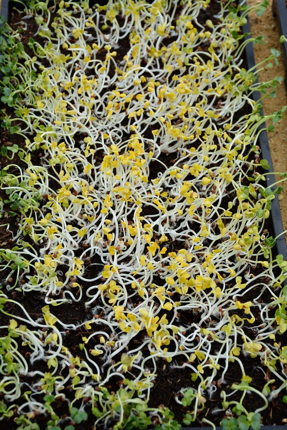 Sous la serre, des pousses de roquette, de radis, de choux-rouges et de diverses plantes aromatiques émergent du compost. Les coloris varient du vert tendre au violet. Elles sont, pour la plupart, récoltées dès l’apparition de la deuxième feuille. « À ce stade, elles sont comestibles, très riches en vitamines. La pousse contient jusqu’à quarante fois plus de nutriments que la plante à maturité ». Certaines espèces ne sont habituellement consommées qu’à l’état de graines. « La plantule de tournesol, par exemple, donne une saveur nouvelle et de la texture aux salades composées », assure le maraîcher en présentant une pousse de fleur. Les plantes aromatiques ne sont récoltées qu’après quelques semaines de croissance. L’oxalis, parfois qualifié de trèfle à fleurs roses ou violettes, révèle une saveur acidulée ou citronnée.