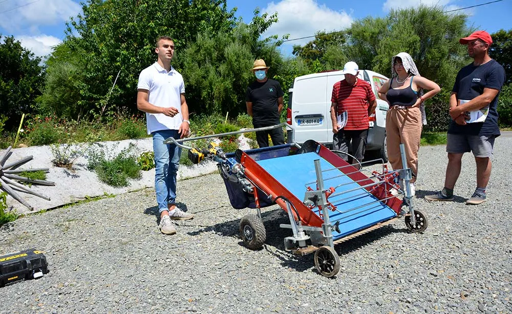 Le fabricant Terrateck propose une large gamme de petit matériel dédié au maraîchage, du semis et de la plantation à la récolte, en passant par le désherbage mécanique. « Ce semoir multi-rangs cache une trémie compartimentée, qui permet de semer de 1 à 12 rangs », explique Alban Grosjean, technico-commercial France pour la société Terrateck. Les graines de cette trémie tombent sur une réglette prépercée à la taille voulue par l’opérateur, « c’est moins cher que des disques, ça se change plus facilement », affirme le représentant. Cette réglette à 2 positions (ouvert ou fermé) doit être « percée à 1 mm au-dessus de la taille de la graine. Il convient aux semis de toutes les graines rondes ». Quatre vis maintiennent la trémie qui se vide facilement, afin de récupérer les semences de mâche, radis, épinards ou autres navets. Lors d’une après-midi de démonstration au potager de Kerrun à Saint-Evarzec (29) chez Damien Pouder, des maraîchers ont pu s’essayer à ces petits matériels ergonomiques entièrement développés pour des cultures légumières sous abri ou de plein champ. S’appuyer sur une canne Les cannes de plantations et de semis « libèrent le matériel végétal une fois la canne plantée ». Sur le modèle PL2, 2 opérateurs mettent en terre rapidement les mottes. « Le 1er insère le plant dans la canne, le second l’enfonce et le libère grâce à une poignée ». Pour le modèle de gabarit plus petit, une seule personne réalise le travail. Une fois les cultures en place, diverses herses étrilles à manches viennent désherber sur le rang, leur agressivité se règle en changeant les dents. Les roues sarcleuses « cumulent le travail de la lame et de la roue. Les adventices sont projetées et sèchent au soleil. Les terres caillouteuses sont à proscrire pour ce type d’outil, qui préfère travailler dans des…
