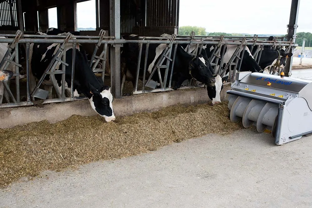 La ration mélangée à l’auge est calée pour une production de 25 kg de lait. Soit par vache et par jour (en matière sèche) : 15 kg de maïs ensilage, 2 à 3 kg d’ensilage d’herbe (prairies de fauche et dérobées avant maïs) autour de 13 à 15 % de MAT, 2,5 kg d’un correcteur azoté plutôt soluble, 500 g de paille. « Le correcteur à 43 % de protéines contient un minéral à la carte enrichi en sel, en levures pour favoriser la digestion et d’un complexe de chélates et biotine pour renforcer l’immunité et limiter le risque de boiterie », précise Johann Cariou, conseiller chez Coréal. « Depuis un mois, nous incorporons aussi 50 g par vache et par jour de méthionine protégée : l’optimisation du métabolisme protéique a permis de baisser l’apport de correcteur de 400 à 500 g par jour en contrepartie. » Notons que la ration est repoussée et remélangée toutes les 3 heures par l’automate Optiduo (DeLaval). « Comme les vaches ont toujours de la nourriture à disposition, cela les stimule et crée du mouvement dans le bâtiment au profit de la fréquentation des stalles de traite », confie Guillaume Rebours.