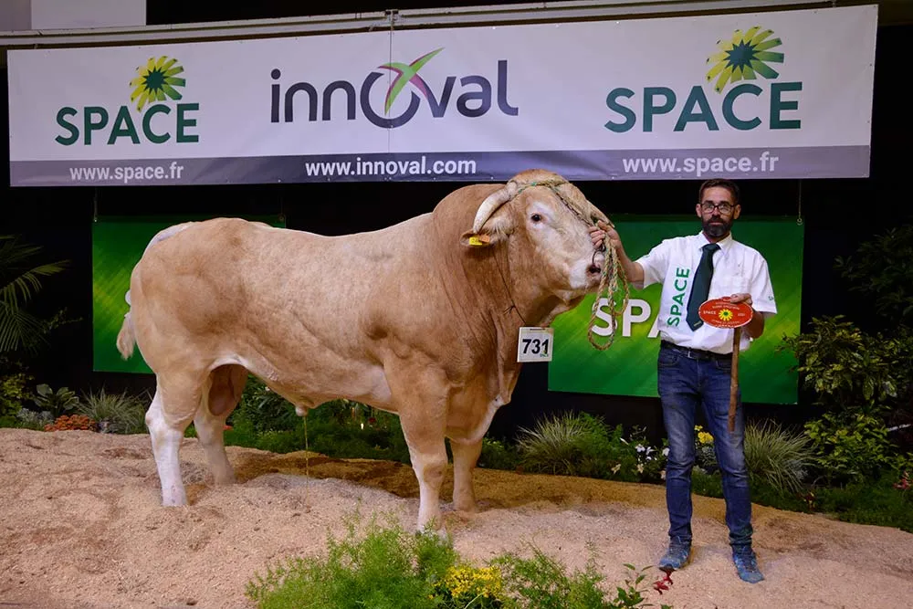 « C’est un animal formidable à regarder défiler, avec de la blondeur de la tête à la croupe, des ischions très marqués. À cela s’ajoute de la finesse dans le cuir et dans l’os, le couple est harmonieux », justifie Laurence Pierre, éleveuse associée avec son mari dans le Calvados (14). La juge pour le concours interrégional Blondes d’Aquitaine au Space a sacré Championne suprême Mouette (Ignace x Hirondelle), femelle suitée de son veau Surfeur. « C’est une vache qui est très belle, son veau annonce un animal qui aura beaucoup de viande », confirme-t-elle. Mouette a aussi raflé le prix de Championne femelle et le Prix de synthèse, qui allie les critères morphologiques et génétiques. La vache suitée de 5 ans est originaire du Gaec Sainte Pauline, de Joué-sur-Erdre (44). Mouette affiche un IVMat de 114. À noter dans la section des femelles suitées de plus de 3 ans, la présence de Livebox et de ses jumeaux Serein et Sesame, de l’élevage de David Basset, du Méné (22).