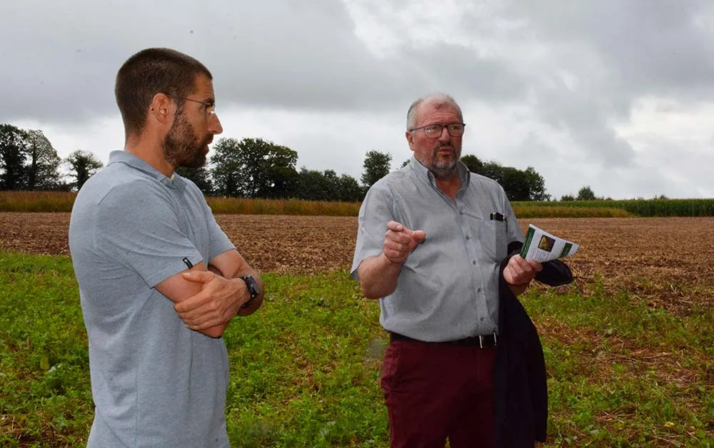 De g. à dr. : Aurélien Dupont, chargé d’étude des essais en bio et Patrice Le Penhuizic, président de la commission bio à la Chambre d’agriculture de Bretagne, dans une parcelle de luzerne, sarrasin et de maïs bio, à la station de Kerguéhennec, à Bignan (56).