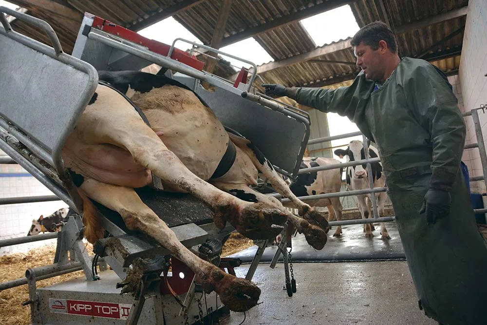 Le basculement est simple, le moteur de la cage de contention est électrohydraulique. Au second plan, le box à tapis accueille les vaches en soin.