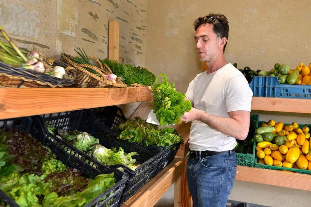Séverine, son sac bien rempli, s’apprête à quitter la parcelle. Guillaume la salue. Déjà quatre ans que le jeune homme a rejoint Sébastien Brazille sur cette exploitation pas comme les autres. Sans doute la première en France à avoir développé le concept de maraîchage associatif, dont il nous détaille le fonctionnement : « Chaque lundi, je fais un tour de la parcelle pour évaluer ce qu’un abonné va pouvoir prendre dans la semaine : combien de courgettes, de salades, de tomates, de carottes… Une cueillette fléchée en quelque sorte. En tout, il y a neuf jardins et trois serres. Chacun porte un nom (Abeille, Bourdon, Coccinelle…) et chaque planche, un numéro. Pour faciliter les choses, je plante un drapeau jaune en bout de planche quand elle est ouverte à la cueillette. Dans le mail, je peux indiquer : jardin Abeille, planche N° 8, un fenouil – ou – un chou-rave. Une alternative qui me permet de gérer les frustrations s’il manque un de ces deux légumes au moment où le cueilleur passe ».