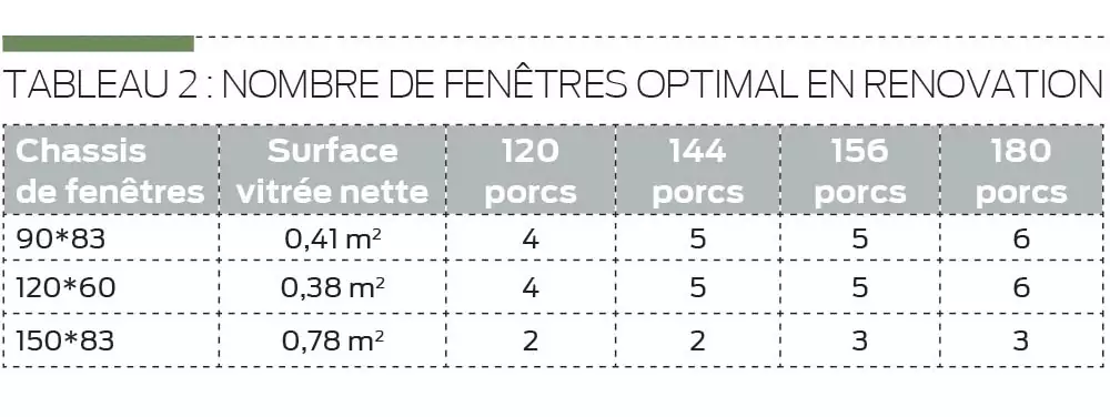 Les fenêtres représentent 88,5 % des points d’accès à la lumière naturelle des bâtiments visités. Environ 1 % seulement des salles disposent de puits de lumière. Si les fenêtres sont nombreuses, elles sont malheureusement assez petites et ne représentent que 55 % de la surface d’accès à la lumière naturelle mesurée sur l’ensemble de l’échantillon. Les translucides, moins nombreux mais beaucoup plus grands, représentent 23 % de la surface permettant cet apport. Enfin, les bâtiments semi-ouverts, équipés de filets brise-vent sont les plus lumineux. L’enquête révèle aussi que 10 % des salles d’engraissement sont aveugles. Elles représentent 45 % des salles aveugles de l’échantillon. Elles n’ont aucun accès sur l’extérieur. Même en envisageant une rénovation, la majorité d’entre elles ne pourrait atteindre 1 % d’accès à la lumière extérieure. Pourquoi ? Parce qu’une fenêtre classique de 90 cm sur 83 cm représente 0,41 m2 de surface vitrée et qu’il en faudrait quatre pour une salle de 120 porcs. Une vraie prouesse pour la portance des murs (cf. tableau 2). Néanmoins, d’autres solutions existent telles que les puits de lumière, le remplacement de tôles par des translucides en bas de rampant…
