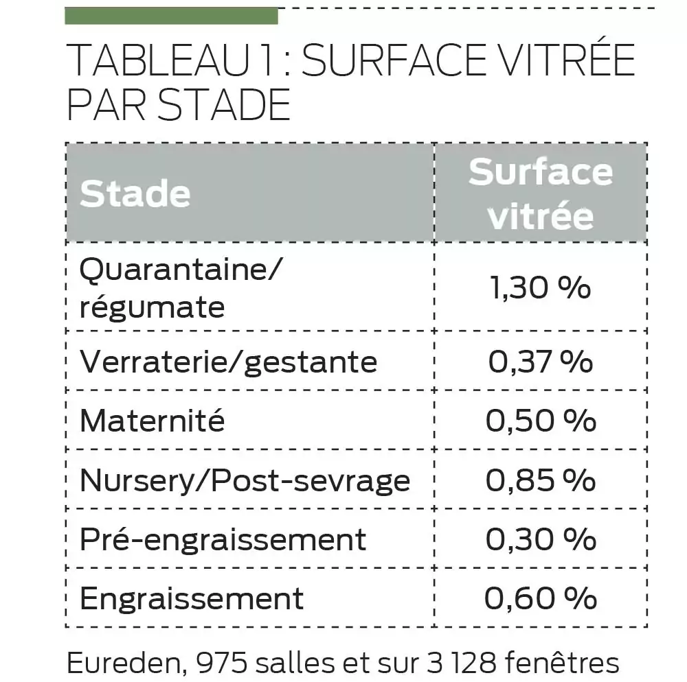 Il est de notoriété publique que la fertilité des truies et la consommation d’aliment des porcs sont meilleures avec un bon éclairage. De même, il semblerait que la lumière directe dans les salles soit un facteur aggravant les comportements d’agression entre les porcs. Eureden établit un constat plus modéré sur ce second point. En effet, si la fertilité des cochettes est bien meilleure dans les salles aux surfaces vitrées plus importantes, la proportion de codes 74 « parage de queue » n’évolue pas avec le nombre de fenêtres.