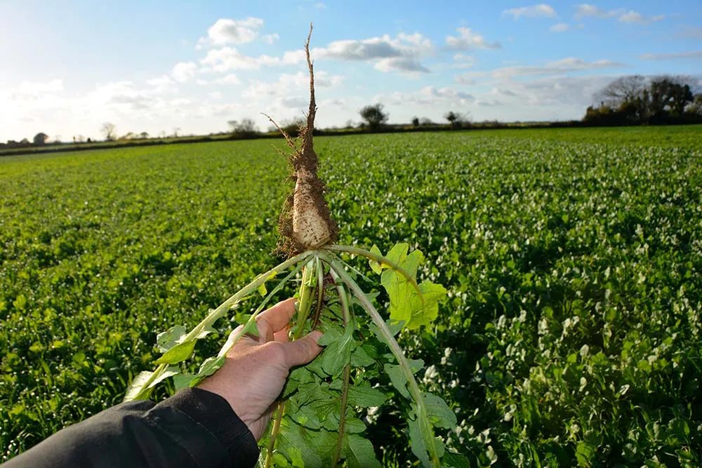 Les reliquats d’azote post récolte de pomme de terre peuvent s’échelonner de 50 à 150 u/ha. « Lors de l’arrachage, on retravaille le sol à une période où il y a encore des températures et de l’humidité, les conditions d’une forte minéralisation sont là ». Un bon couvert dense semé après pomme de terre captera l’azote du sol : après arrachage, le reliquat d’azote a été mesuré à 95 u. Avec le couvert Complys Triflass, ce reliquat est tombé « à 66 unités en prenant les 3 horizons du sol », chiffre Cécile Goupille. « Cet azote n’est pas perdu, les racines bien développées du couvert iront les chercher », rassure Philippe Dolo. Le mélange Complys Triflass est composé de 3 kg de radis, 1,8 kg de phacélie, 1,2 kg de trèfle d’Alexandrie. Semé le 21 septembre dernier, son coût est de 42 € HT/ha. Les racines des radis se sont parfaitement développées dans le sol, l’espèce présente un C/N bas. « C’est aussi le cas de la moutarde d’Abyssinie, qui a un développement lent et qui ne monte pas en C/N. Peu ligneux, l’azote contenu dans la plante sera en partie disponible pour la culture suivante quand la moutarde d’Abyssinie se dégradera », fait observer Philippe Dolo.