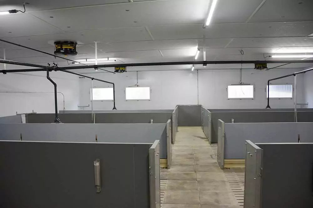 Les salles de ce nouveau bâtiment sont peintes en blancs pour accentuer davantage la clarté. L’éleveur post-sevreur engraisseur met l’accent sur l’ambiance autour des animaux. « La principale problématique concerne la ventilation. J’ai souhaité me différencier de la norme avec des hauteurs sous plafond de 3 m pour améliorer l’ambiance. Néanmoins, c’est d’autant plus de volume à chauffer et à ventiler. Le système Flud’R a été sélectionné pour cela, et permet une très bonne répartition de l’air à 360 ° ».