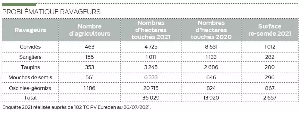 L’année aura été marquée par de fortes attaques de mouches de type géomyza au stade 1 à 2 feuilles du maïs entraînant des pertes de pieds allant de 5 à 50 % sur les semis d’avril. Plus de 20 000 ha touchés ont été recensés par les techniciens cultures d’Eureden. Les corvidés ont attaqué autour de 5 000 ha, entraînant également des pertes importantes de pieds. Ils ont été surtout présents sur les semis de mai. Les taupins ont quant à eux touché plus de 3 000 ha selon la constatation dans les parcelles des adhérents. Face à ces aléas climatiques de plus en plus fréquents et la pression ravageurs permanente, il est extrêmement important d’actionner tous les leviers agronomiques pour permettre à la culture de se développer dans les meilleures conditions tout au long du cycle. Au niveau d’Eureden tous ces leviers agronomiques sont regroupés dans la démarche Serenity.