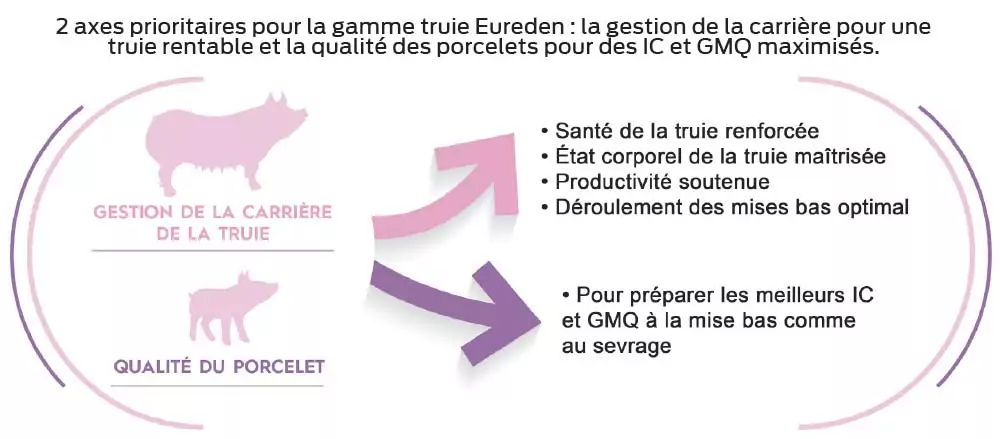 Les aliments Truie Eureden ont été travaillés selon 2 axes pivots : la gestion de la carrière des truies, pour optimiser la rentabilité, et la qualité des porcelets à la mise bas et au sevrage.