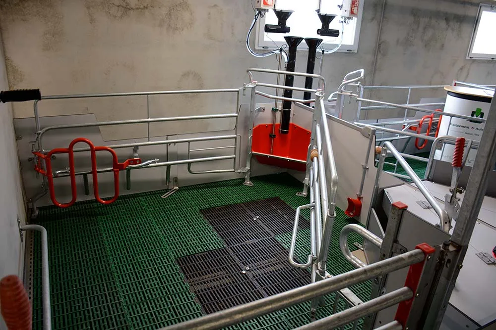 Les éleveurs ont opté pour 2 salles de maternités liberté de 20 places chacune plutôt qu’une seule de 40. « Nous avons une conduite en 5 bandes avec un sevrage à 21 jours. Le bâtiment est évolutif ce qui nous offre la possibilité de changer de conduite si nous le souhaitons ou si de nouvelles attentes sociétales apparaissent », explique l’agricultrice. Après plusieurs visites d’élevages ce sont les cases maternités liberté de type Funki de la marque Aco qui ont convaincu les éleveurs costarmoricains. Les cases font 2,7 m sur 2,55 m. L’objectif est la liberté au maximum pour les truies. Elles rentrent en maternité le jeudi ; le lundi elles sont bloquées pour être débloquées une semaine plus tard après la mise bas. Les cases sont accessibles à partir d’un couloir avant et d’un couloir central. « L’idée est de rentrer le moins possible dans les cases. Le couloir avant permet d’accéder facilement à l’alimentation et à l’abreuvement sans avoir à rentrer. Par le couloir central, nous pouvons intervenir dans les nids », observe Stéphane Litalien.