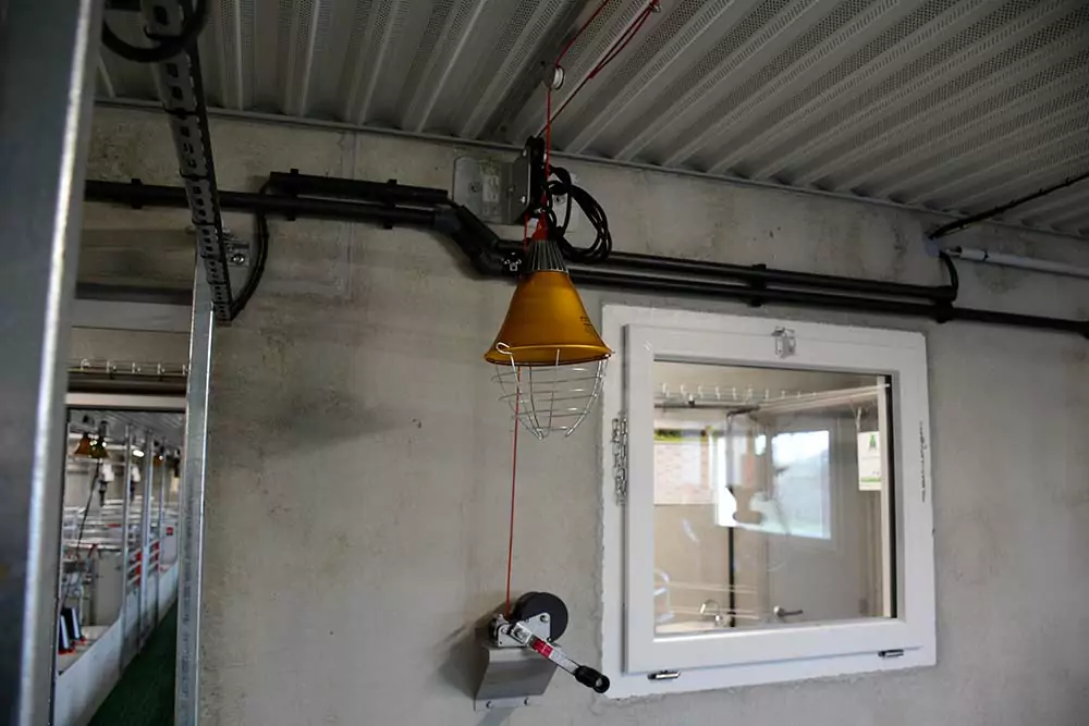 Une chaudière gaz couplée à un réseau d’eau chaude assure les besoins en chauffage des salles d’élevage. « Nous avons choisi ce mode de chauffage par eau chaude qui offre la possibilité de changer d’énergie plus tard si le coût du gaz grimpe trop fortement. » Les niches des porcelets sont équipées de plaques chauffées grâce à l’eau chaude. Une lampe chauffante régulée est descendue dans chaque case à l’aide d’un treuil. Cela permet d’avoir un point de chauffe dans chaque case au moment de la mise bas en attendant que les porcelets rejoignent le nid chauffé à 30 °C. Une température qui descendra progressivement jusqu’à atteindre 27 °C. « Le coût de la place de maternité comprenant le bâtiment, l’équipement d’élevage, les sols… (hors chauffage) est de 7 300 €. »